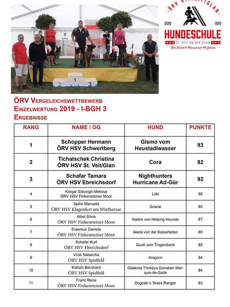 Der Mannschaftsvergleichswettbewerb des „ÖRV - Österreichischer Rassehundeverein“ gehört zu den Pflichtterminen im Turnierkalender vieler österreichischer Hundesportler. Diesmal traf man sich bei der Ortsgruppe St. Veit in Kärnten, die gleichzeitig ihr 40. Bestandsjubiläum feierte. In allen Klassen der I-BGH traten Starter an. Unter dem strengen, aber