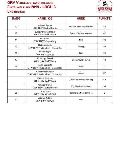fairen Auge von Leistungsrichter Robert Diesenreither wurde hervorragende Leistungen gezeigt. In der I-BGH-1 ging der erste Platz zum ÖRV HSV Klagenfurt am Wörthersee, an Birgit Moser (90 Punkte). Der erste Platz in der I-BGH-2 ging ebenfalls nach Kärnten, an Marina Waltrisch (90 Punkte) vom ÖRV HSV Finkensteiner Moor. Den obersten Stockerl-Platz in der